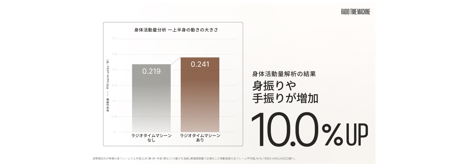 また「RADIO TIME MACHINE」の使用時と非使用時における利用者の様子を、表情解析・骨格推定を用いた活動量解析・発話速度の観点で比較したところ、3つの結果が得られました。