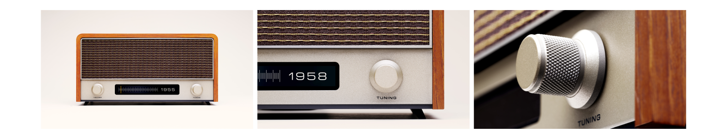 筐体のデザインは、80歳から90歳の高齢者が若い頃に親しんでいた、1950年代から60年代のラジオ機器をモチーフとして採用。液晶画面にはラジオ機器のような目盛や指針が映し出されますが、そこに表示される数字は周波数ではなく西暦になっています。ダイヤルを回すと1950年から2025年まで1年刻みに指針を操作でき、聞きたい西暦に指針を合わせると、その西暦の操作している日と同じ日付のラジオ番組風の音声コンテンツが再生されます。