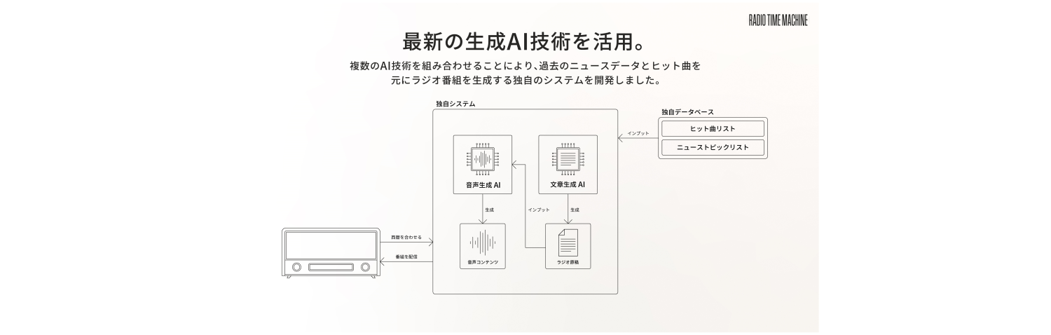 音声コンテンツで流れる過去の出来事は、独自に作成したニューストピックリストに基づいています。ニューストピックリストを作成する上では、Wikipediaに掲載されている過去の出来事を参照しており、各年のニューストピックリストをもとに生成AIが当時のラジオ番組を模したニュース原稿を自動生成します。その原稿を、AIボイスが当時のラジオ番組風に読み上げることで、まるで過去のラジオパーソナリティがその日の出来事を紹介しているかのような音声コンテンツが生成されます。またヒット曲については、当時の流行などを反映した独自のヒット曲リストを作成し、デジタル配信用の音源データをニュースの合間に再生。これにより、ラジオ番組のような構成の音声コンテンツが完成します。