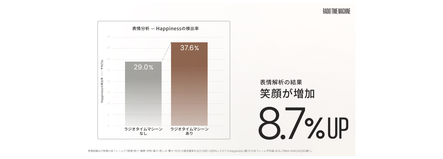 1. 表情解析を行ったところ、過去を振り返り当時の思い出に浸ることで、笑顔の値(口角の角度や頬の挙上を検出)が平均として8.7%上昇するという結果が得られました。中には、ラジオを聴くことで、23.8%値が上昇した利用者もいるなど、笑顔が増えました。