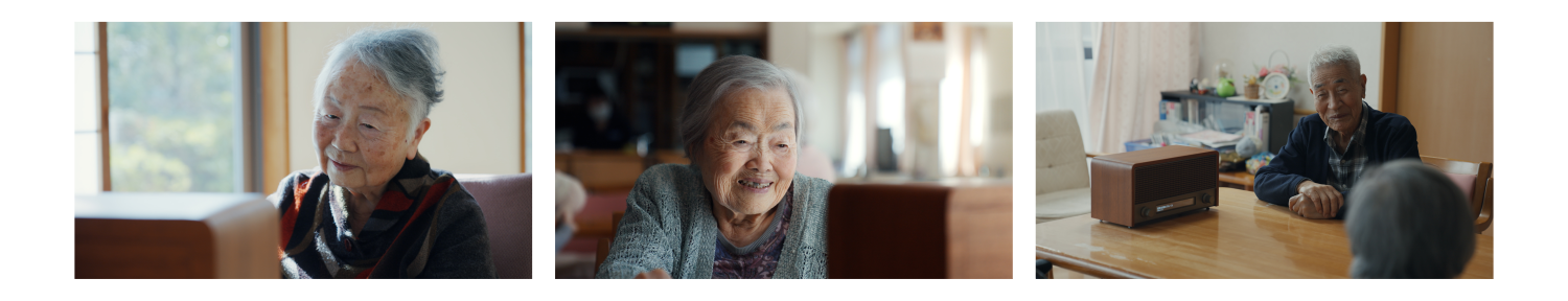 事前実証の様子など、実際に利用者がRADIO TIME MACHINEを体験する様子を収めたドキュメンタリー映像です。映像ではRADIO TIME MACHINEから流れてくる音声コンテンツを聞いて、利用者の記憶が呼び起こされたり、笑顔になる様子をまとめています。