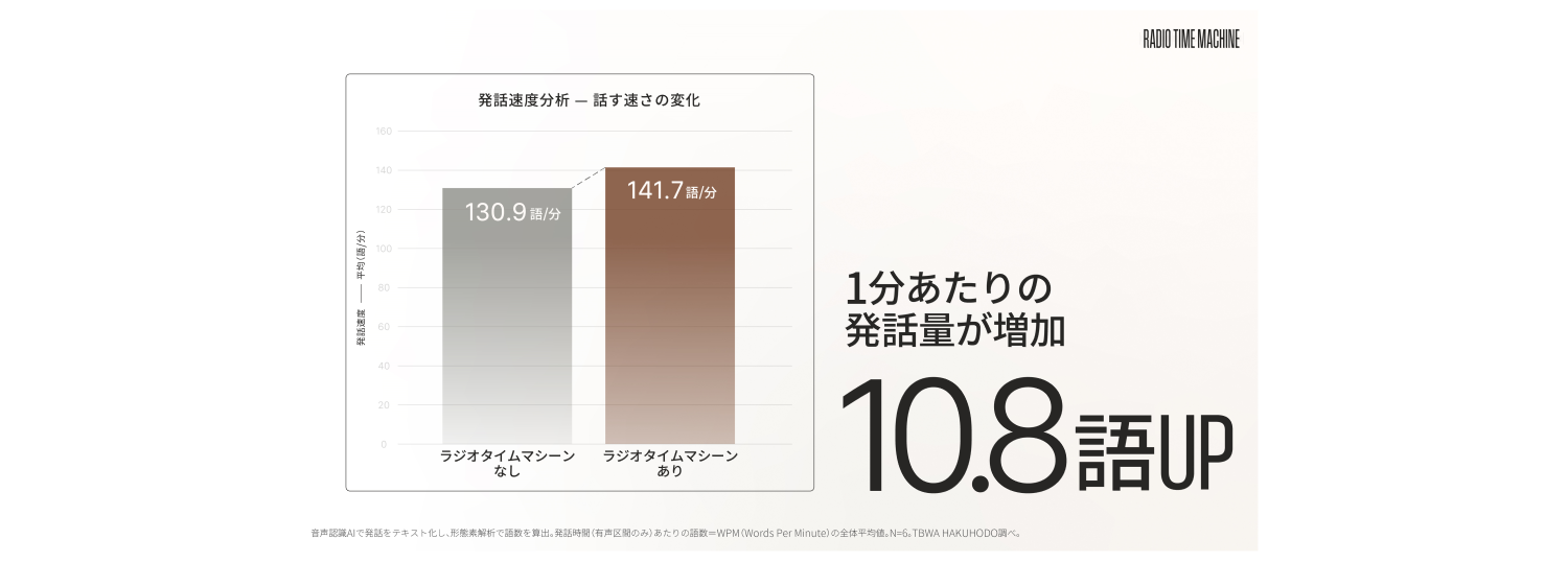 3. 発話速度の分析を行ったところ、1分あたりの発話量が10.8語増加するという結果が得られました。ラジオを聴くことで様々な記憶が呼び起こされ、それを相手に伝える意欲が高まったのではないかと推察しています。