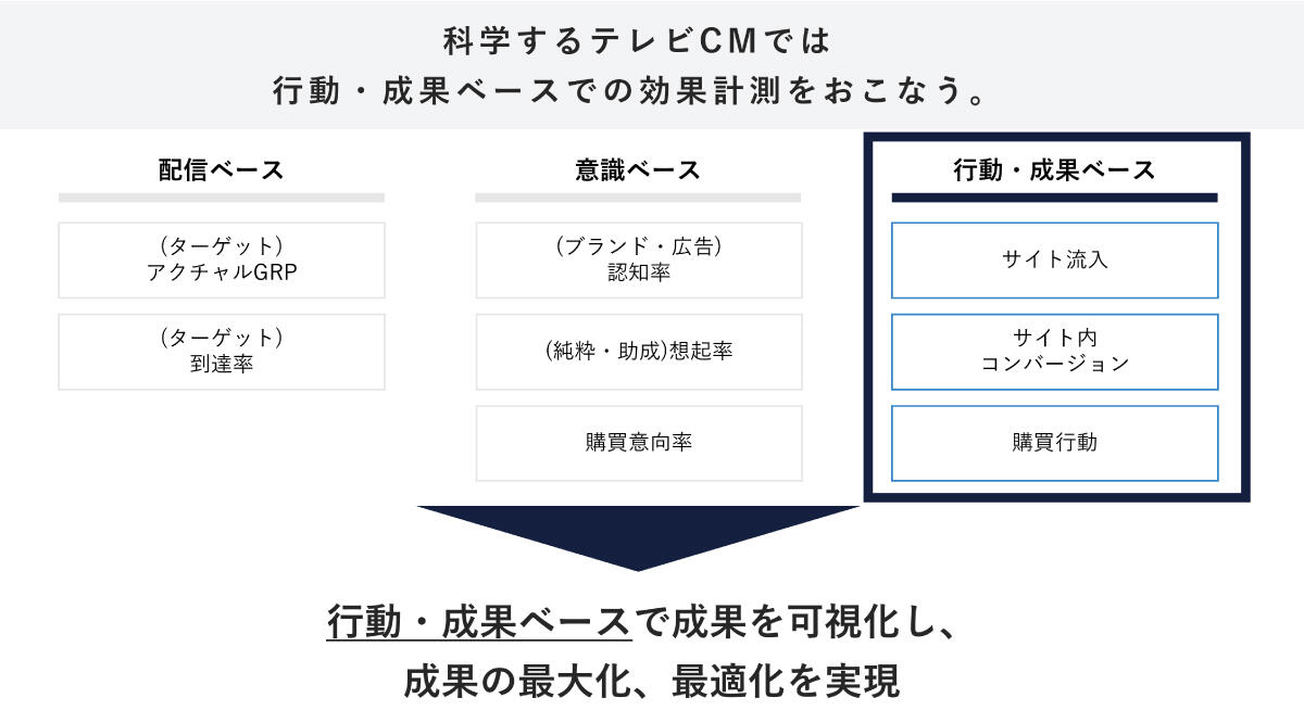 つまり、テレビCMはサイトに連れてくるまでは大きな役割を担っていたが、「購入完了」については、また別の刺激を入れる必要があったという仮説が導かれます。このような数値の読み解き方で、テレビCMの説明責任を果たせるものにしていきます。