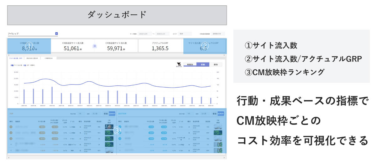 映枠ごとにも評価をつけているので、「行動・成果ベース」であるサイト流入を指標とし、CM全体や放映枠ごとの効果・効率を可視化することができます。