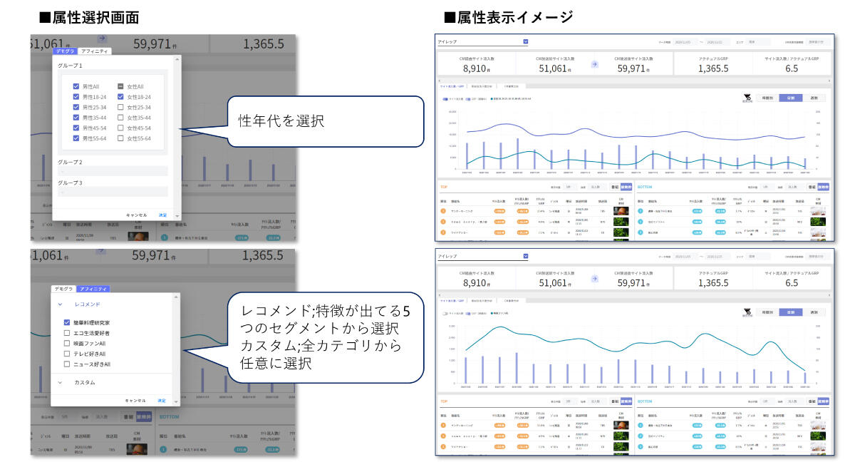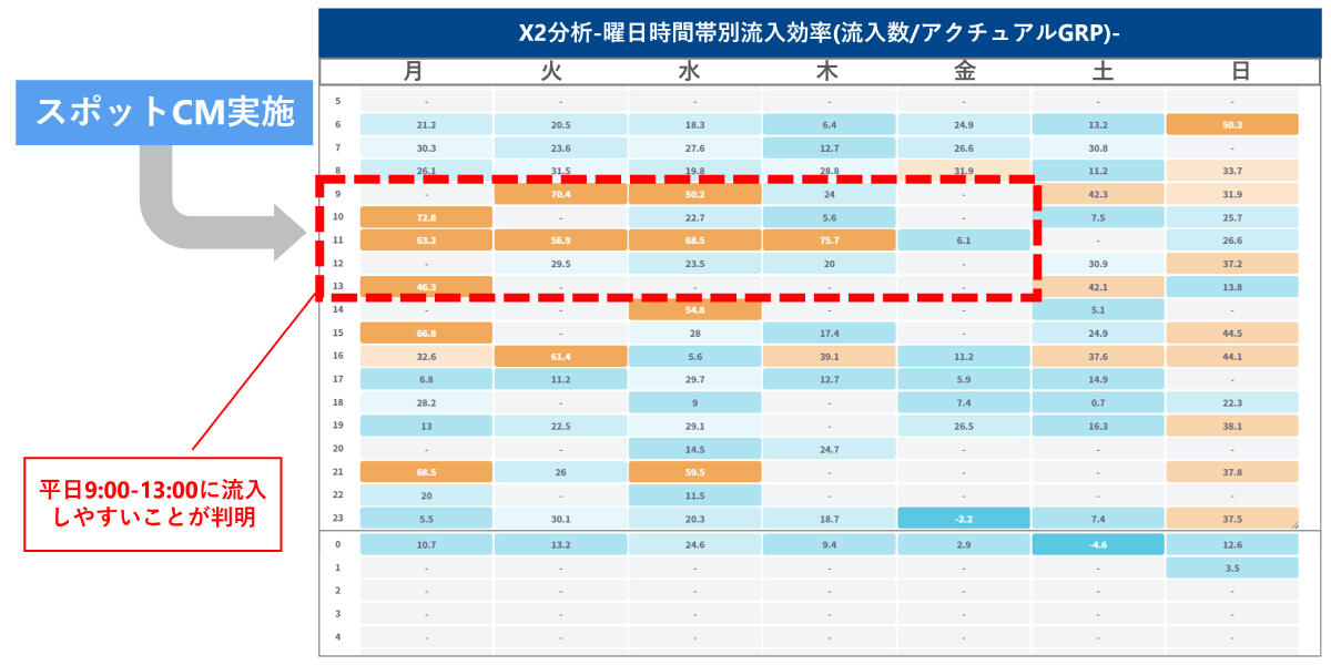 一般的には、効率指標である「1GRPあたりのサイト流入」の成績がいい曜日や時間帯は厚めにCMを流したいので、ゾーニングや線引き・改案のときに希望を出すなど、放送局との交渉の根拠に使うことを想定しています。