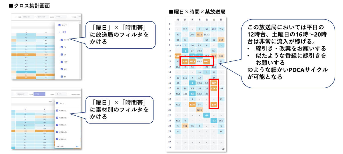 具体例としては、この放送局において平日の12時台と土曜日の16~20時台にサイト流入における効果・効率がよさそうなので、線引きの際にお願いするとか、改案希望を出す際の根拠にするPDCAサイクルを可能にします。