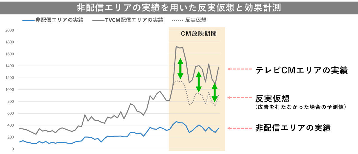 前回ご紹介した因果推論を利用して、広告を打たなかった場合のKPIを予測し、CM放映期間全体で「サイト流入」や「サイト内コンバージョン」がどの程度リフトしたのかを可視化することができます。