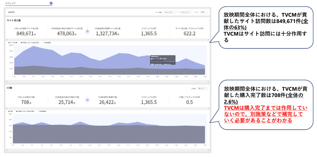 ここからわかることは、「サイト流入」は全体の60%以上がテレビCMによってリフトしたと算出されており、一方で「購入完了」については全体の3%弱しかテレビCMによってリフトしなかったということです。