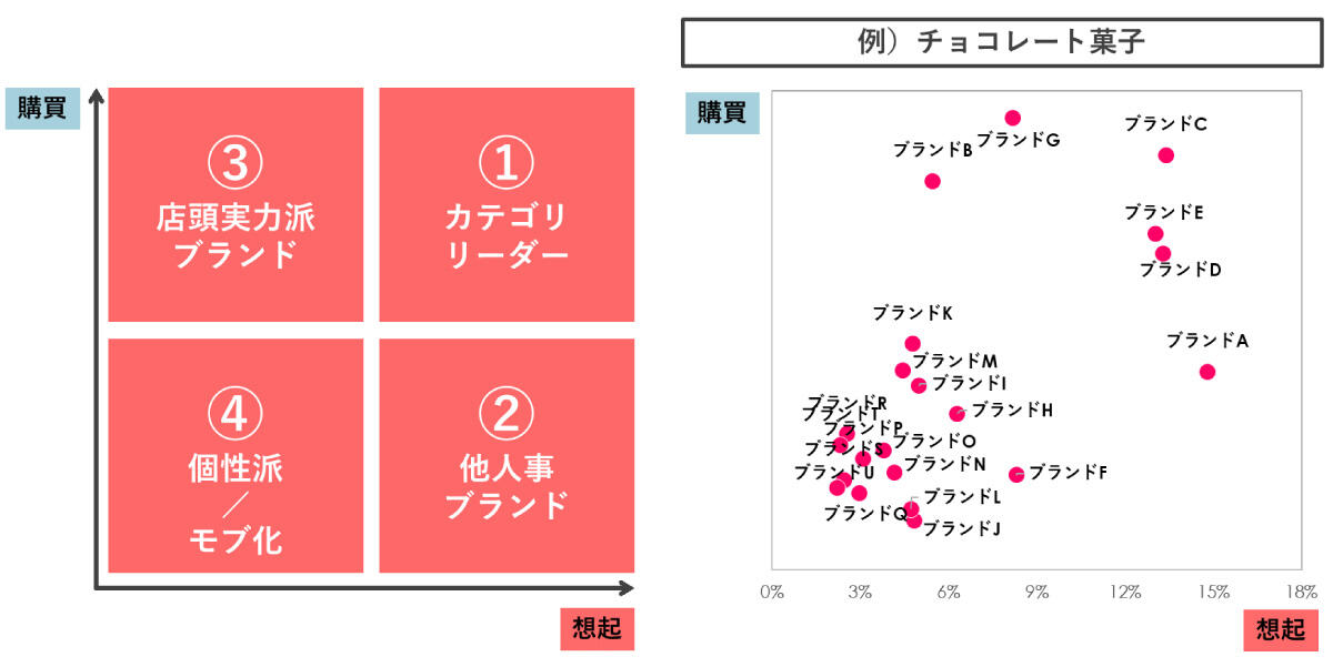 想起と購買を掛け合わせたマッピングにより、市場ポジションの可視化が可能となります。ポジションは大きく4つのゾーンに分類され(「カテゴリリーダー」「他人事ブランド」「店頭実力派」「個性派またはモブ化」)、どのゾーンに位置するかによって対策をとるべきファネルが異なってきます。