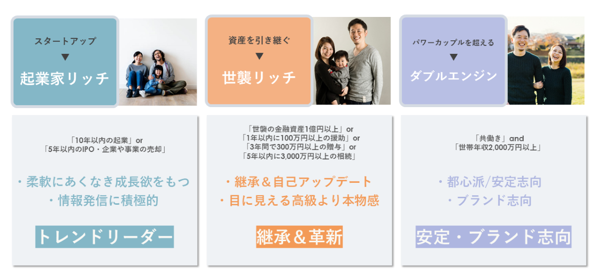 今回の研究では20~40代の若年リッチ層にフォーカスしました。この若年リッチ層は、これからの消費をけん引する「令和リッチ」として、具体的には3つの層にさらに分類したうえで、分析を行いました。まず、起業した会社や事業を売却して富裕層になった「起業家リッチ」、代々資産を引き継いできた「世襲リッチ」、そして共働きで年収2000万円クラスの世帯である「ダブルエンジン」です。