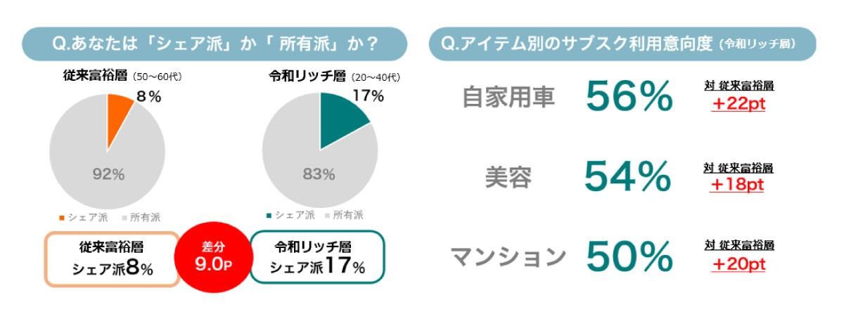 令和リッチの1つの特徴として、所有派が多い富裕層に比べ、所有欲がそれほど高くなく、サブスクやシェアへの関心が高いといった傾向があります。