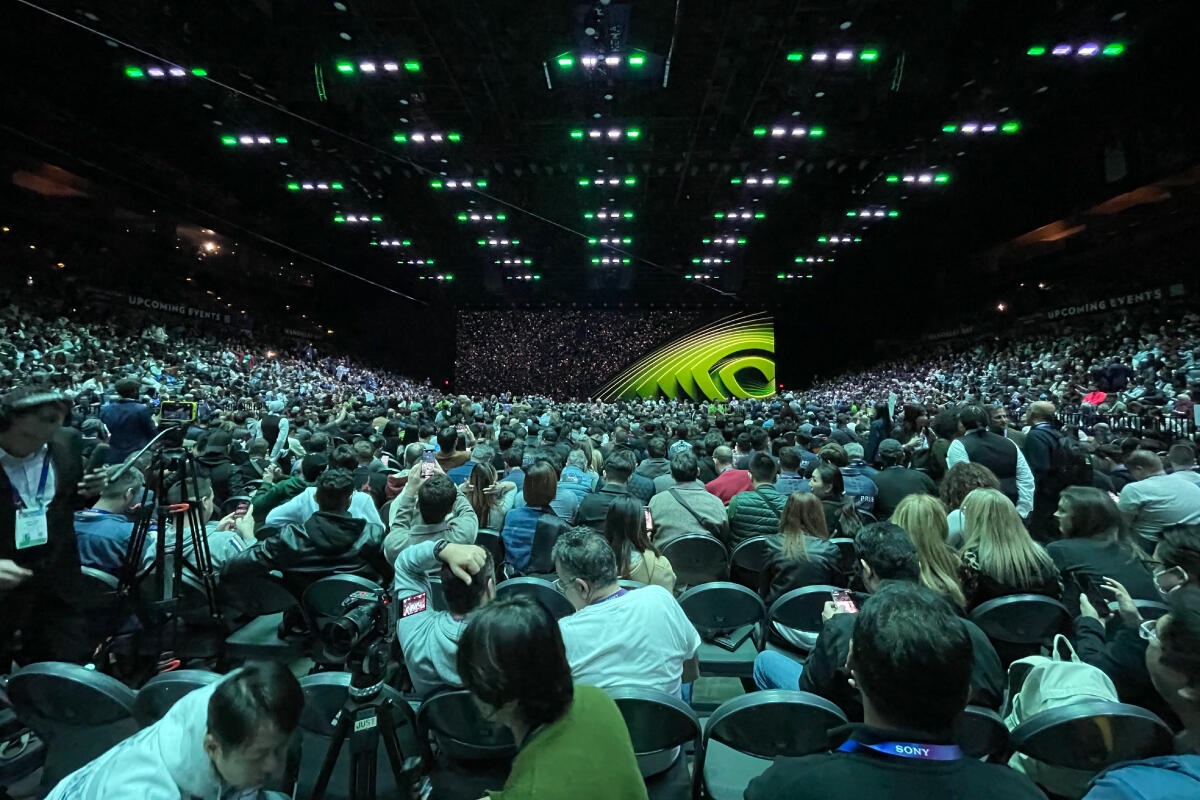 今年特に注目を集めたのは、NVIDIAのジェンスン・ファンCEOによる基調講演でした。通常キーノートは2千数百人規模の会場で行われますが、NVIDIAのキーノートは1.2万人収容の大規模なスポーツアリーナが用意され、それでも満員になるほどの人気ぶりでした。開場前から会場前には長蛇の列ができ、入場打ち切りで入れなかった人たちからは不満の声も上がっていました。