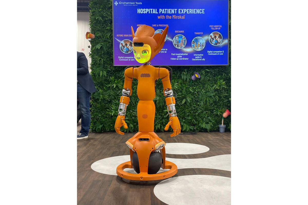 また昨年、各国のスタートアップの展示が集まる Eureka Park会場に出展していたフランスのロボット企業Enchanted toolsは、今年はLVCC会場でより大規模に展示。足元がボール状になってバランスを取る人型ロボットで自由に移動や方向転換が可能。生成AI搭載で会話も自然で、顔の部分の表情も多彩。病院での患者との話し相手としてや、店頭での販売アドバイザー、飲食店でのウェイターとして既に活躍しているとのこと。会場で記者からの取材に上手に受け答えしていました。