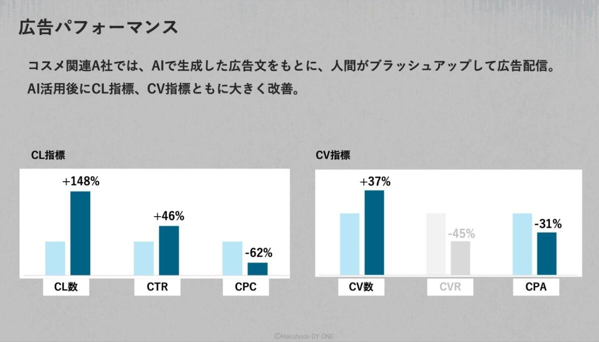 実際に、コスメ関連の企業で広告配信した事例では、AIで生成した広告文をもとにして最終的に人間がブラッシュアップして配信したのですが、AI活用後では図のようにCL指標、CV指標ともに大きく改善が見られました。このように、AIをうまく活用することで、広告パフォーマンスにも好影響を与えると思っています。