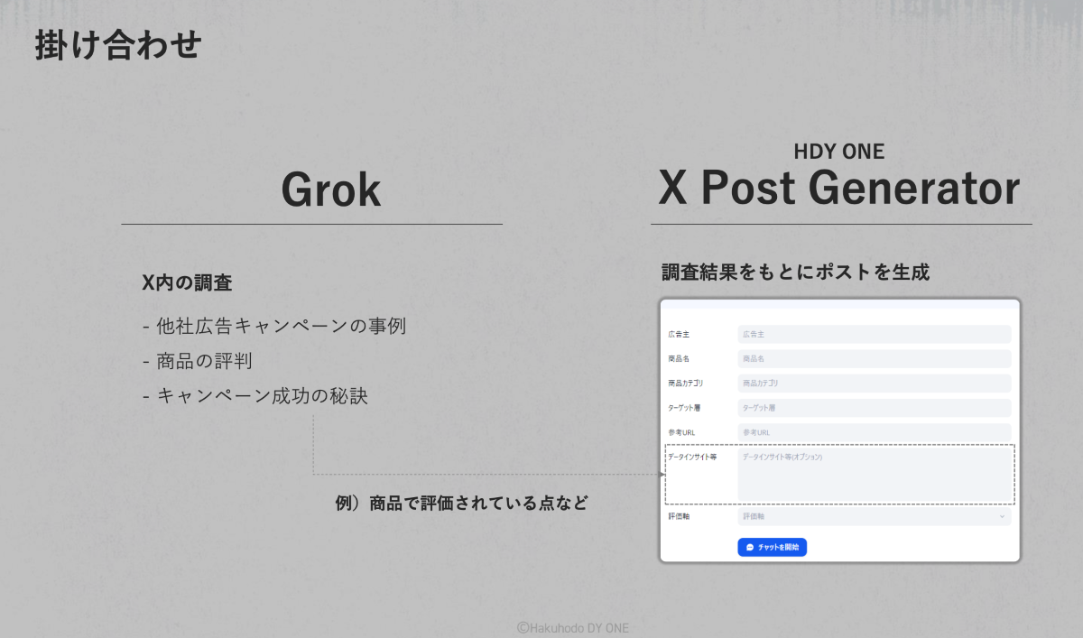 X Post Generatorはこうした課題に対処する形で設計されています。Xに特化したHakuhodo DY ONEのナレッジを実装し、さらにはXが保有するナレッジも活用することで他社との差別化につながり、モーメントカレンダーの実装や案件個別の分析結果の入力、その情報をもとにした投稿文の生成など、最適化されたアウトプットが可能になります。