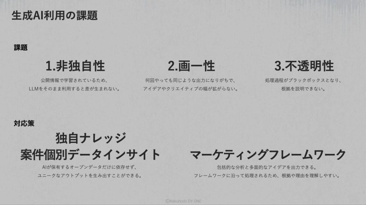 LLM(大規模言語モデル)が公開情報をもとに学習されているからこそ、そのまま利用するだけでは差が生まれず、同じような出力結果になりがちであり、AIの処理過程も不透明ゆえに根拠を説明できないという課題感があるわけです。
