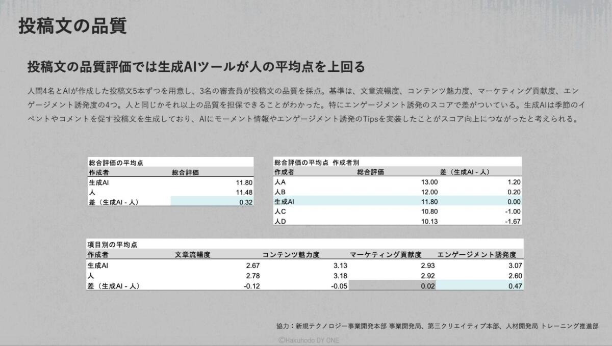 投稿文の品質は、人間4名とAIが作成した投稿文を、審査員がいくつかの視点から品質評価を行ったところ、X Post Generatorが人の平均点を上回る結果となりました。特に「エンゲージメント誘発度」というスコアが高くなっています。