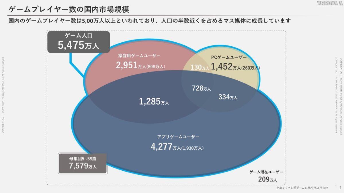 まず人数ですが、『ファミ通ゲーム白書2025』の公開データによりますと、家庭用ゲーム、ゲームアプリ、PCゲームのトータルで国内に5,400万人を超えるユーザー人口が存在すると言われています。以前は「ゲームは教育に悪い」といったネガティブなイメージを持たれがちでしたが、そういった状況は徐々に変化し、現在では年代を問わず、人口の約2人に1人がプレイするような環境になってきています。