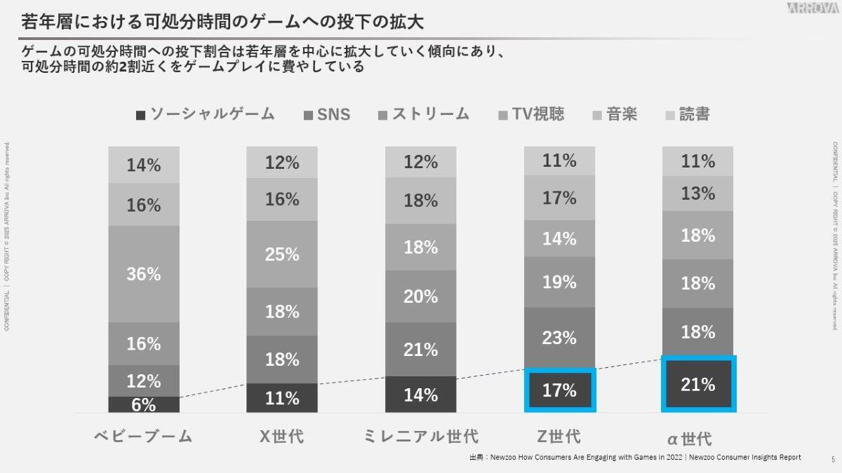 時間の概念で見ますと、世代差はあるものの25歳以下ではSNS利用に匹敵する時間を、α世代にいたってはSNSよりもゲームに時間を費やしていることがわかります。人数の観点でも、時間の観点でも、ゲームはパブリックな存在になっていると言えるのではないでしょうか。