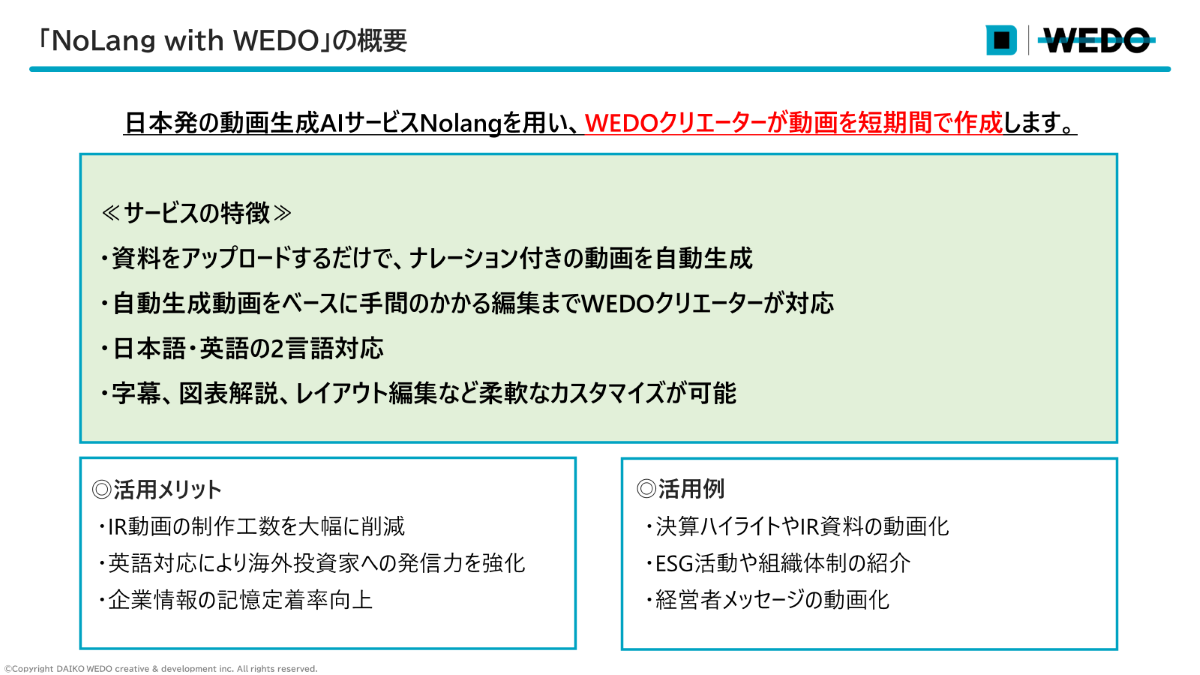 お話いただいた背景があるなか、大広WEDOではMavericks社と業務提携を結び、NoLangを通じて、IR動画の革新と企業価値の伝達力向上を図っていく取り組みを始めています。NoLangに企業のIR資料をアップロードするだけで、ナレーション付きの動画を自動生成できるのが特徴で、日本語・英語の2言語対応、字幕や図表解説、レイアウト編集など柔軟なカスタマイズが可能になっています。