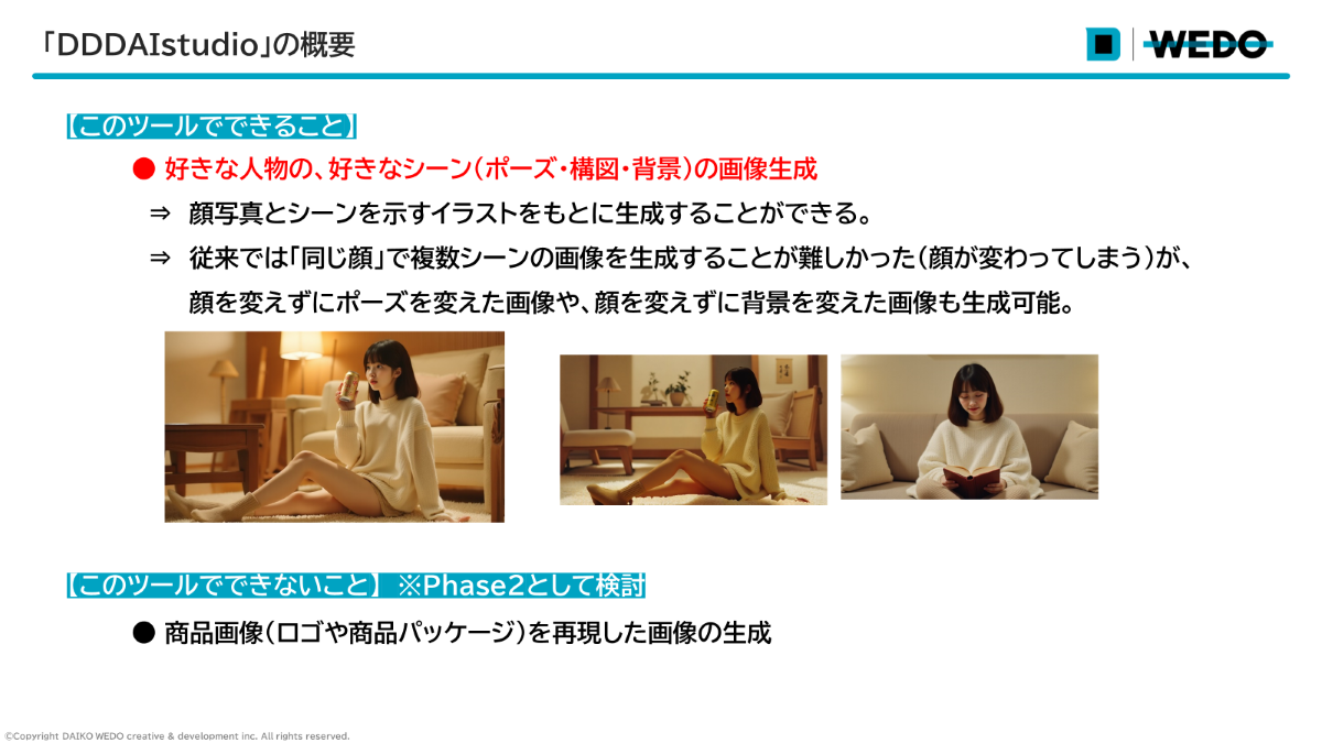 従来の生成AIでは、「同一人物での複数シーン展開」が難しかったのに対して、DDDAI StudioはLoRAデータと詳細なプロンプト操作により、自然なポーズ制御と背景差し替えを実現しました。広告制作における「撮影」「CG制作」といったプロセスの工数・コストを大幅に削減し、クオリティとスピードの両立を目指したプロダクトになっています。
