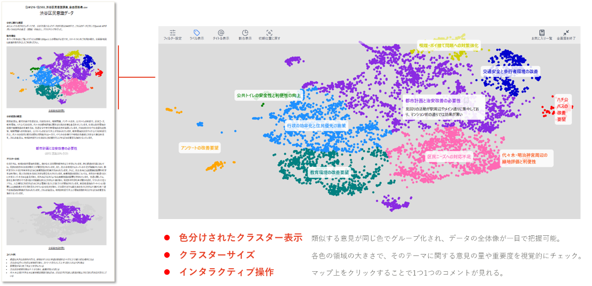 岡村:「こえまぷ」は、現在代表的な活用例として、アンケートの自由回答や、顧客からの問い合わせ内容はもちろん、SNSやレビューサイトの口コミ、ワークショップでの発言録など、さまざまな定性データが対象になります。もとが公聴会記録の分析のため、行政や自治体での活用とも非常に相性がいいですね。