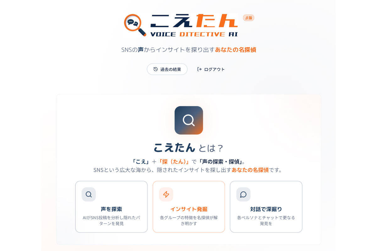 そこで、「特定ブランドについて語る人たちの声」からAIペルソナを立て、そのペルソナと対話しながらインサイトを掘り下げられるようにしたのが「こえたん」です。