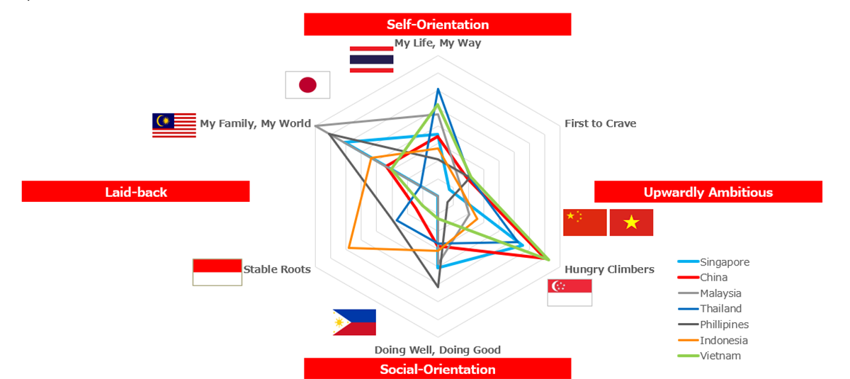 LOUIS: Gen Zs all over the world grew up in a digital environment. Gen Zs across Asia share similar traits, such as being adept at social media, being emotionally intelligent and having a desire to seek like-minded peers for community belonging. The key point of interest lies in the differences, with the factors driving these disparities rooted in the unique macro-social environments of each country. Based on macrosocial environments, we can see how Gen Zs in different countries have different life values from each other. We identified Gen Z personas for each country based on the axes self-orientation vs. social-orientation and upwardly ambitious vs. laid-back. For example, the most representative characterization of Gen Z in China and Vietnam is the self-driven Hungry Climber who has social aspirations and believes that money is a symbol of success. They seek brands that appropriately reflect their social status and align with their aspirations. Singaporean Gen Zs share characteristics of both Hungry Climbers and My Family, My World, who value family relationships over everything else. On the other end of the spectrum, Thai Gen Zs are not so particular about social aspirations and prefer living at their own pace: they are best characterized as My Life, My Way. Gen Zs from Malaysia, Indonesia and the Philippines generally prioritize family and religious traditions. For the Gen Zs in these countries, brands that emphasize community tend to resonate well.