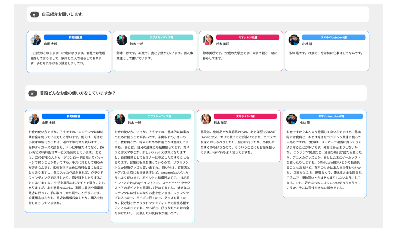バーチャル生活者は一度に複数設定して、チャット形式のUIで同時に会話することができます。1つの問いに対して賛成や反対などにとどまらない様々な角度からの意見を得ることができ、社員の創造性を刺激することが可能です。