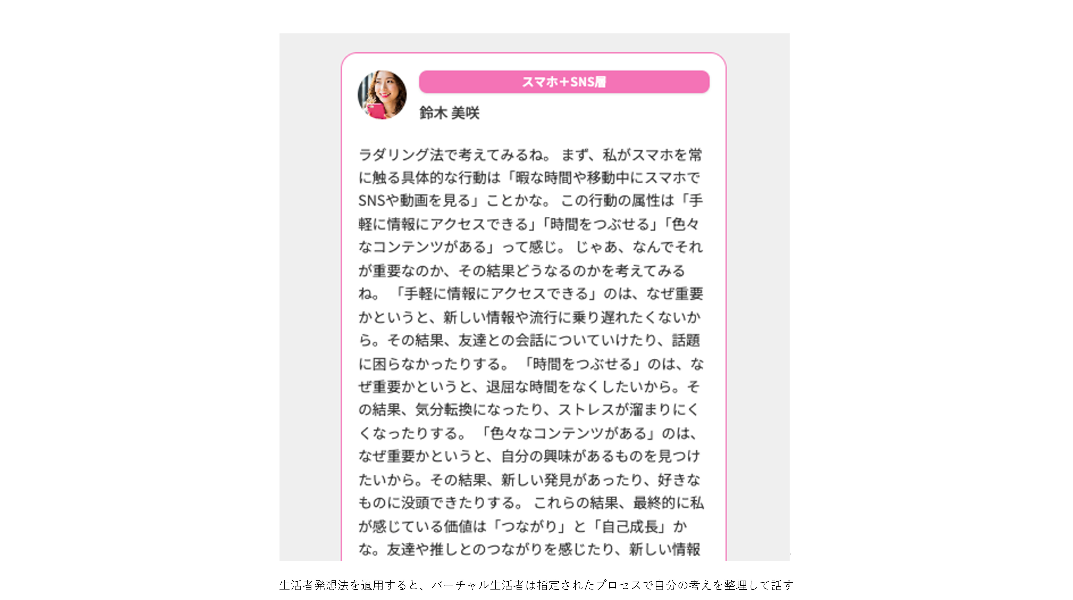 そのため、より実際の市場での在り方に近いリアルな生活者を再現でき、取り組む業務やマーケティング課題にあわせたバーチャル生活者を選ぶことができます。利用者は自らのアイデアや疑問をもとに、バーチャル生活者との質の高い対話を通して、新たな問いやヒントを得ることができます。