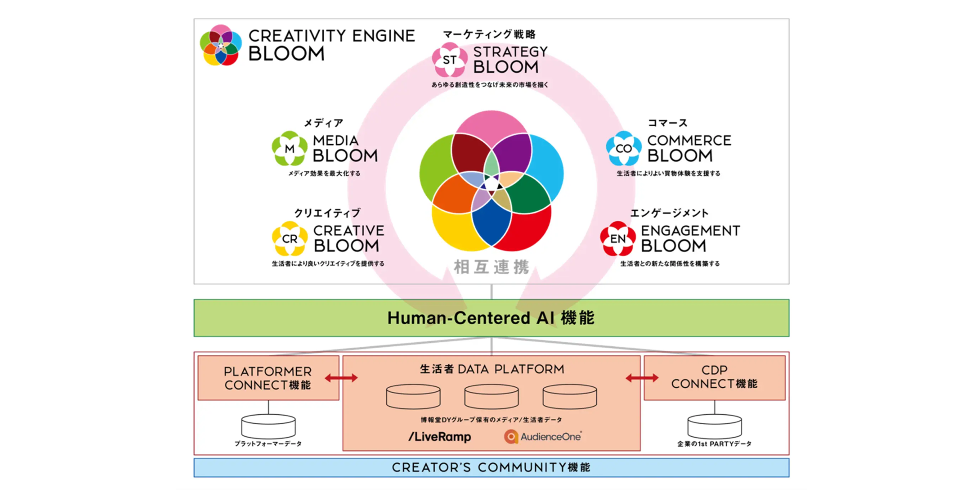 「バーチャル生活者」は統合マーケティングプラットフォーム「CREATIVITY ENGINE BLOOM (クリエイティビティ エンジン ブルーム)」(以下 BLOOM)の根幹となる機能として、今後BLOOMの様々なプロダクトと連携します。グループ社員の創造性を拡張し、新たなサービスやビジネス創造の支援、マーケティング・コミュニケーション業務のさらなる高度化と効率化を目指していきます。