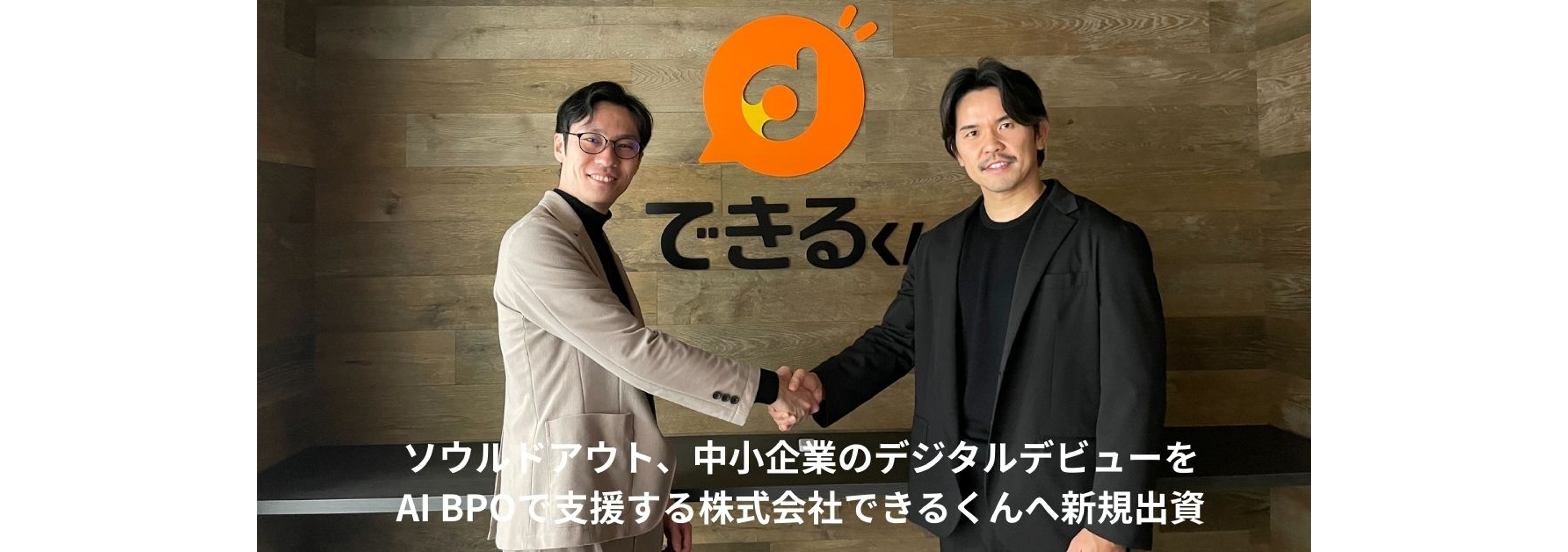 博報堂DYグループのソウルドアウト株式会社(本社:東京都文京区、代表取締役社長CEO兼CCO:荒波修、以下 ソウルドアウト)は、中小企業のデジタルデビューをAI BPOで支援する株式会社できるくん(本社:東京都新宿区、代表取締役:岩田真、以下 できるくん)へ新規出資を行いました。