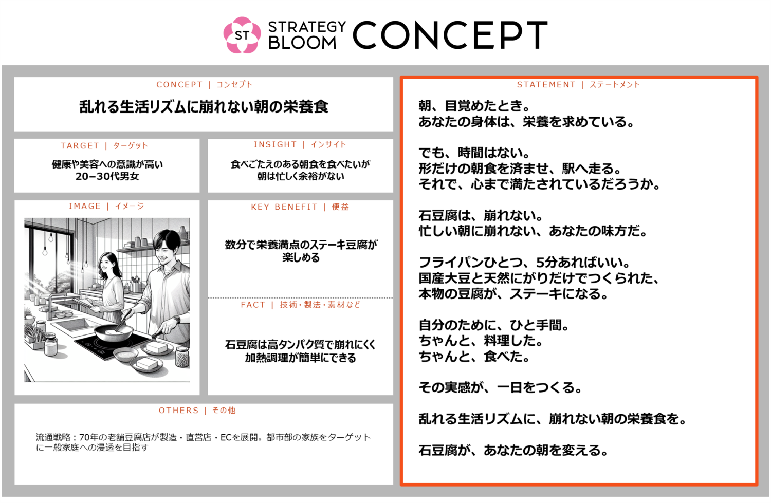 - 戦略と表現の一貫性担保:コンセプト開発によって作り出したブリーフシートをベースに文章化するため、ステートメント制作のの過程で生じがちな「戦略のズレ」を抑え、マーケティング戦略の狙いを確実に具現化します。