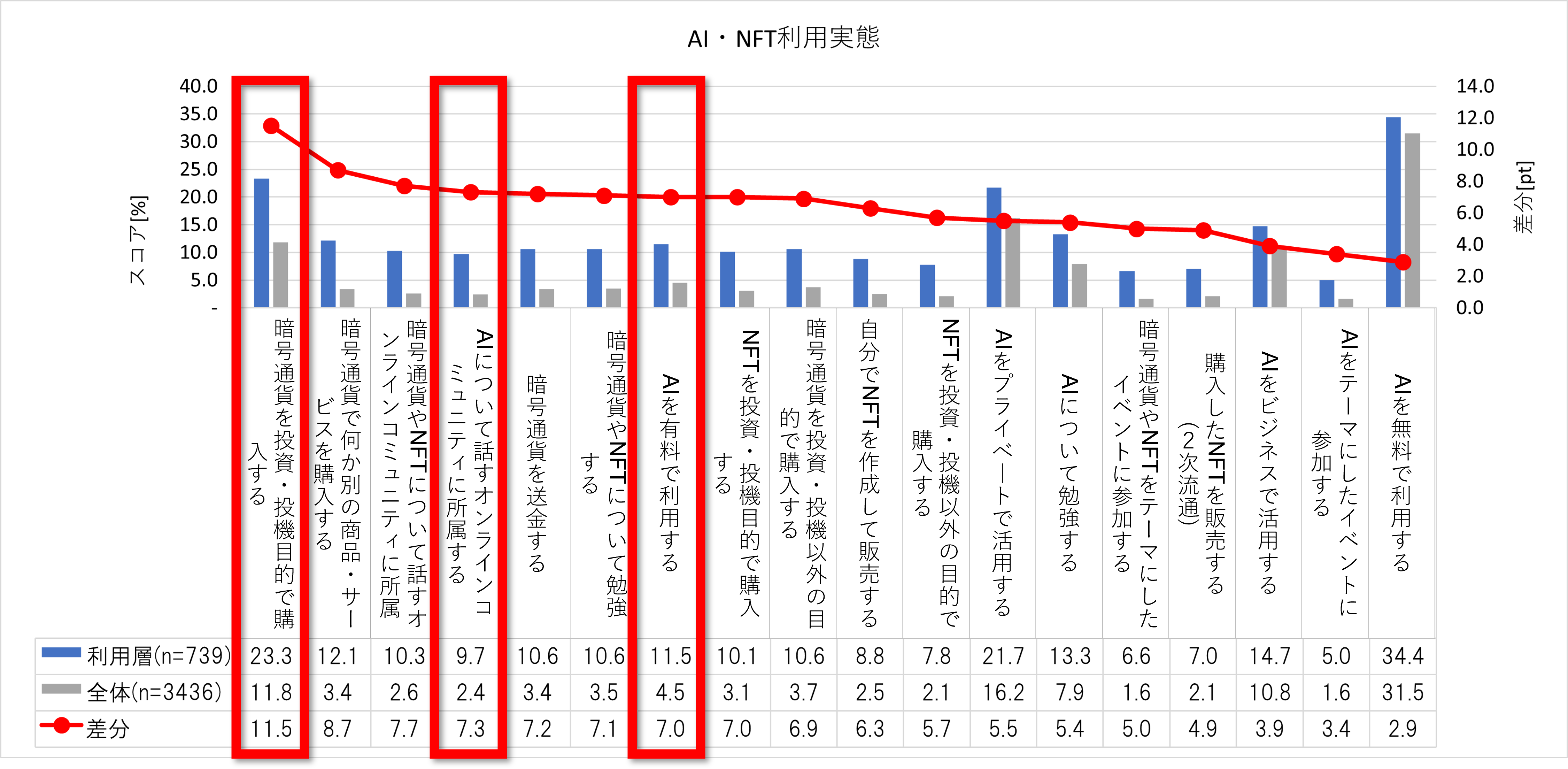 メタバース利用層のAIやNFT/暗号資産などの利用実態を確認すると、「AIを有料で利用する」は11.5%(全体4.5%)、「AIについて話すオンラインコミュニティに所属する」は9.7%(全体2.4%)、「暗号通貨を投資・投機目的で購入する」は23.3%(全体11.8%)と、全体を大きく上回っています。メタバース利用層は最新技術を単なる知識としてではなく、実益や創作活動のためのツールとして積極的に投資・活用している層であることが窺えます。今後は、現実世界での生成AIサービス同様に、メタバース空間内で使える生成AI機能を実装することで、メタバース利用層はアバター衣装やワールド装飾などの生成・共有・販売など、メタバース内でのクリエイティブ/経済活動の発展に貢献してくれる可能性が考えられます。