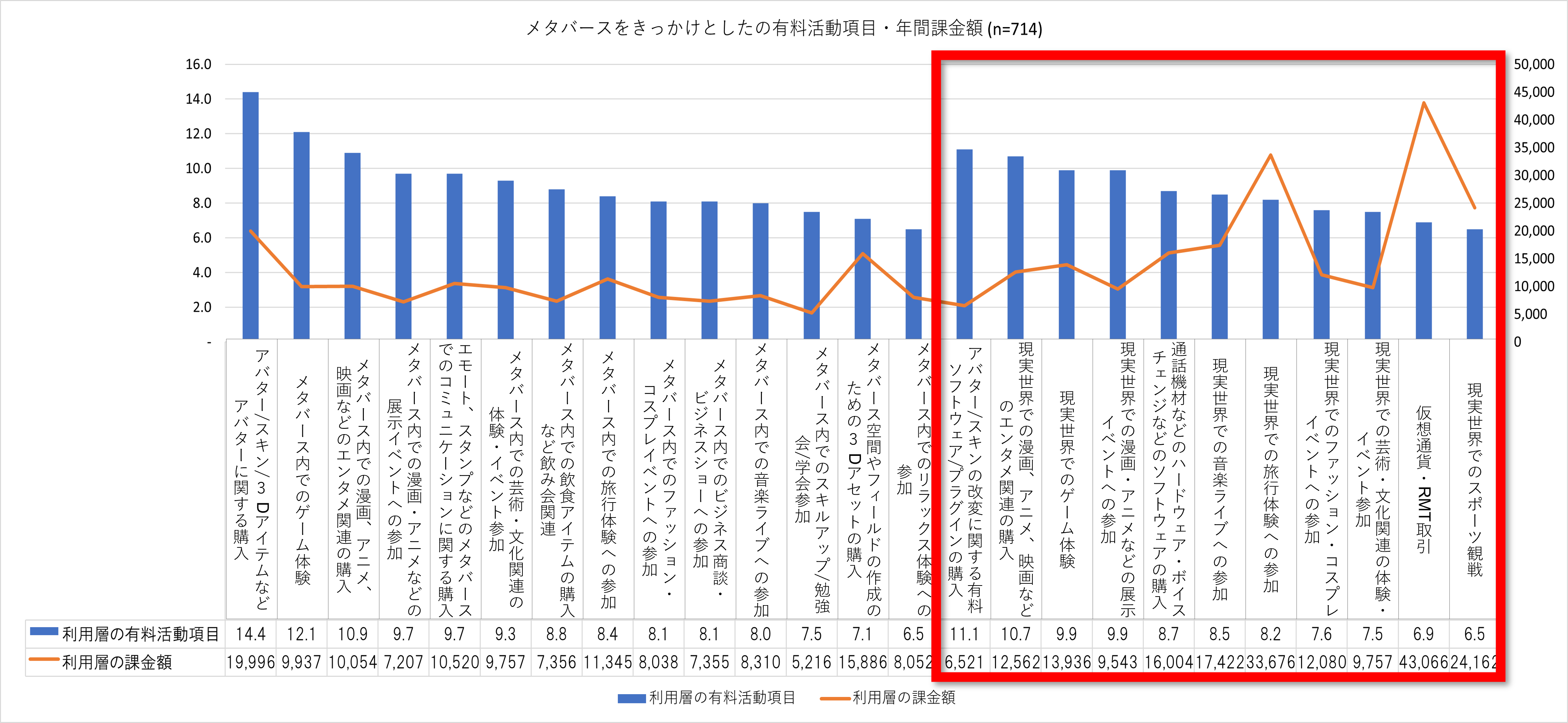 利用層のメタバースをきっかけとした有料消費行動と年間課金額を確認すると、「アバター/スキンの改変に関する有料ソフトウェア/プラグインの購入:11.1%(6,521円)」、「現実世界での漫画、アニメ、映画などのエンタメ関連の購入:10.7%(12,562円)」のように、メタバースをきっかけに現実世界で消費行動を行っていることが確認できます。特に「現実世界での旅行体験への参加:8.2%(33,676円)」、「現実世界でのスポーツ観戦:6.5%(24,162円)」などの年間課金額は、メタバース空間内におけるどの有料消費行動よりも高い結果となりました。メタバース利用層は、メタバースでの活動をきっかけにメタバース空間内だけでなく、現実世界でも消費行動を行っており、ジャンルによっては現実世界での課金額が非常に高いことが窺えます。