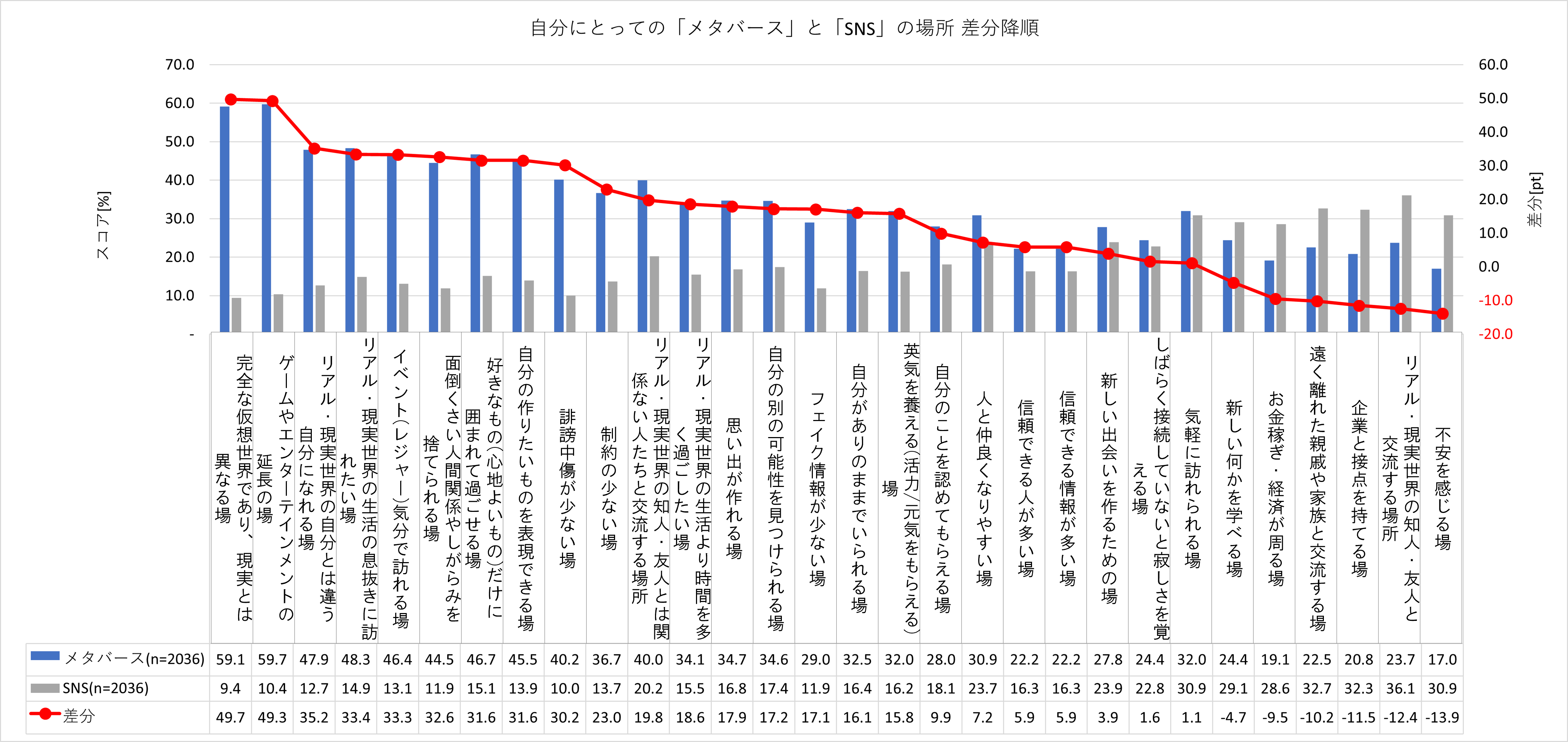 また、メタバース認知層(興味層・利用層含む)に、SNSとメタバースの存在を比較すると、役割の違いについても明らかになりました。SNSは「現実の知人・友人との交流の場(36.1%)」「遠く離れた知人・家族と交流する場(32.7%)」である一方、「不安を感じる場(30.9%)」のスコアが相対的に高い傾向にあります。対してメタバースは、「完全な仮想世界であり、現実とは異なる場(59.1%)」、「ゲームやエンターテインメントの延長の場(59.7%)」「現実世界の生活の息抜きに訪れたい場(48.3%)」「自分の作りたいものを表現できる場(45.5%))」として認識されており、SNSと比較すると生活者にとって「エンタメの延長としての場所や自己表現もできる解放の場所」として機能しています。