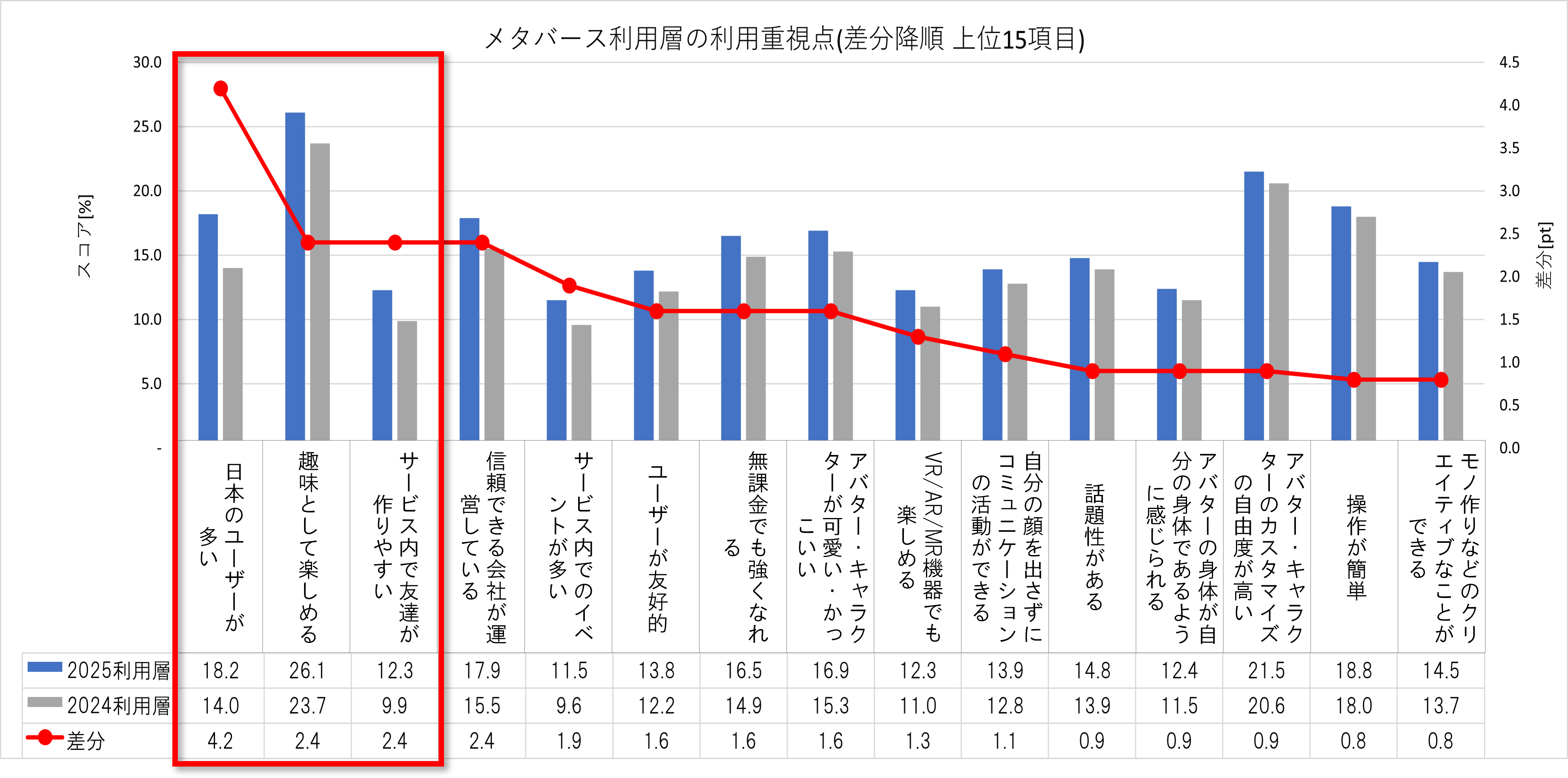 ●メタバース利用層の重視点は「実用的コミュニケーションができる場」へシフト