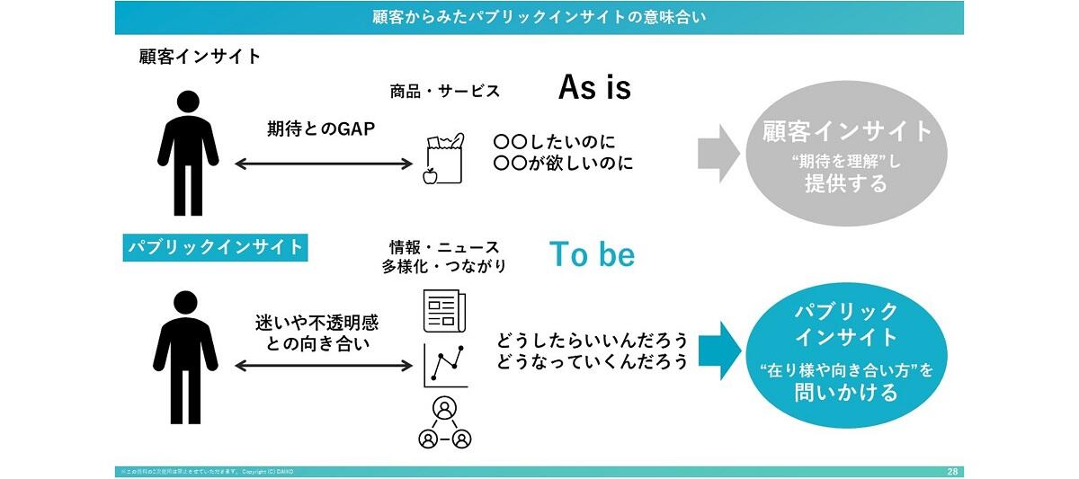 これまでの顧客インサイトが「商品・サービスへの期待」であり、これを理解して期待に応える商品・サービスを提供することで瞬間的な効果を生むものだとすれば、パブリックインサイトは「社会全体のモヤモヤを言語化し共感をもたらす」ものです。