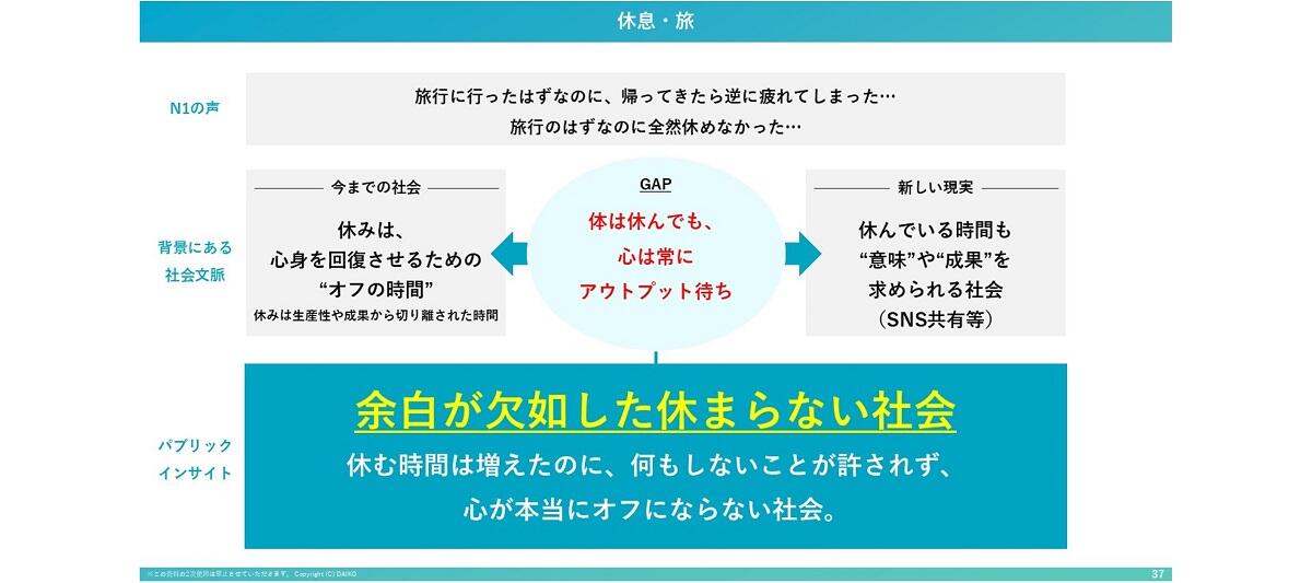 上記のパブリックインサイトを言語化することで、「何もしないこと」を全面的に肯定するブランドメッセージの発信や、デジタルから離れて心からオフになるリトリートプランの企画など、中長期的な事業テーマと具体的な打ち手の創出へと繋げます。