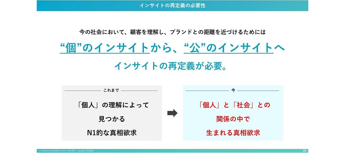 こうした「個」と「企業」が抱える共通の課題を解決するため、インサイトの再定義が必要と考えました。そこで、個人の声を社会全体の文脈で捉え直し、未来の価値をデザインする新フレームワーク「パブリックインサイト」の共同開発に至りました。