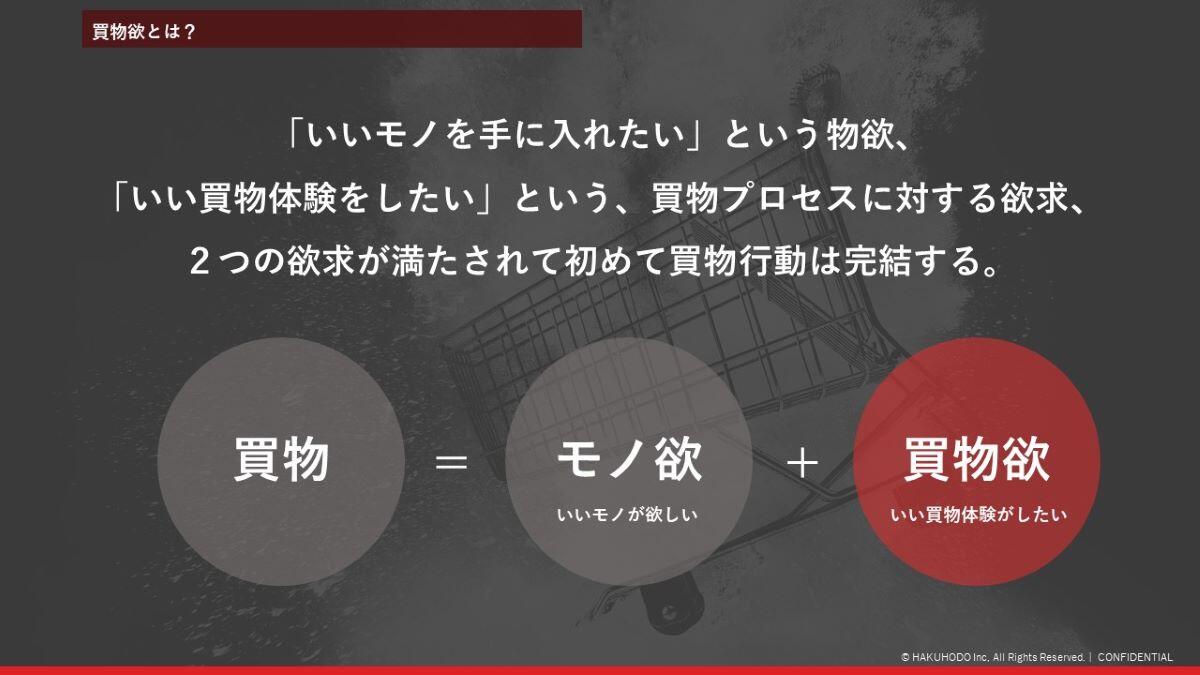 「買物欲」とは、いい買物体験をしたい」という欲求、すなわち買物プロセス自体に対する欲求を指します。私たちは買物欲を、「いいモノが欲しい≒モノ欲」と全く別の概念であると考えています。現代では良い商品が多く機能価値だけでは差別化が難しいし、各社のマーケティング活動も素晴らしいので情緒価値だけでも差別化が難しくなってきていると感じます。そんな中で、生活者が買いたいと思うかどうか?は、「買物体験の良さ」でこそ差がついてくるのではないでしょうか。買物は「買物(カイモノ)欲」と「物(モノ)欲」が合わさって完結する、その中でも「買物欲」が果たす役割が大きくなっているのではないかと思います。