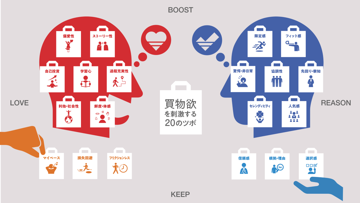 「買物欲のコントロール方法」については、買いたい気持ちを増幅させる「BOOST」タイプと、買いたい気持ちが流れないように維持する「KEEP」タイプのツボがあります。「買物欲を刺激する方法」については、感情に訴えかける「LOVE」タイプと、理性や理由で訴えかける「REASON」タイプのツボに分けられます。