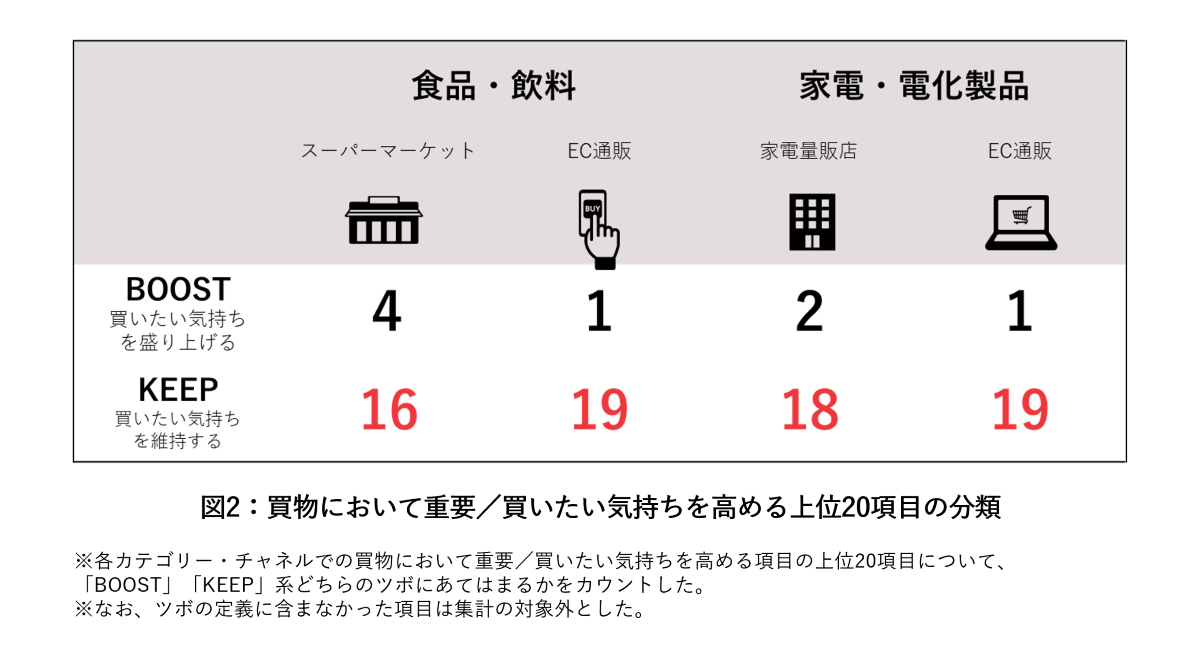 「食品・飲料」と「家電・電化製品」の買物において、生活者が重要だと思う要素の上位20項目をみてみると(下図)、「BOOST」タイプのツボに関わる要素よりも、「KEEP」タイプのツボに関わる要素が上位に数多くランクインしていることがわかります。この傾向は「化粧品」「トイレタリー・日用品」など他のカテゴリーやチャネルでも共通しており、生活者の"ネガティブを回避したい"気持ちがうかがえます。