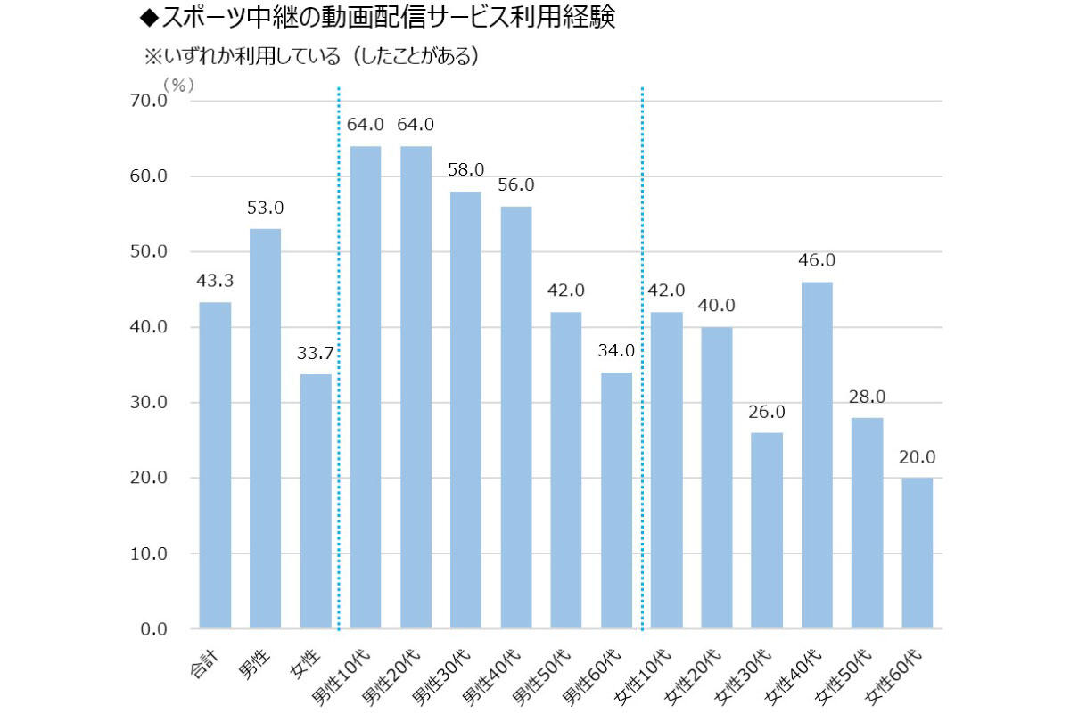 スポーツ中継の動画配信サービス利用経験を見てみましょう。