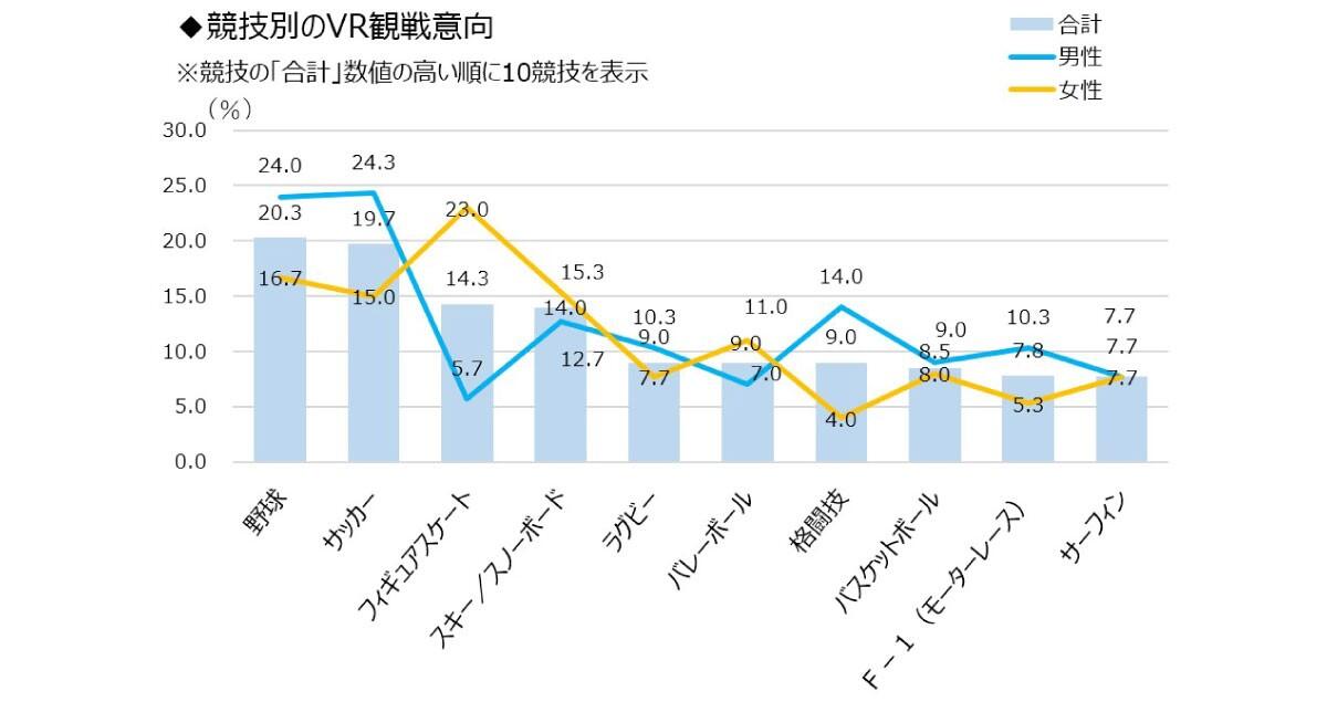 ・VR観戦意向は野球、サッカー、フィギュアなどが高く、競技別で違いがある。