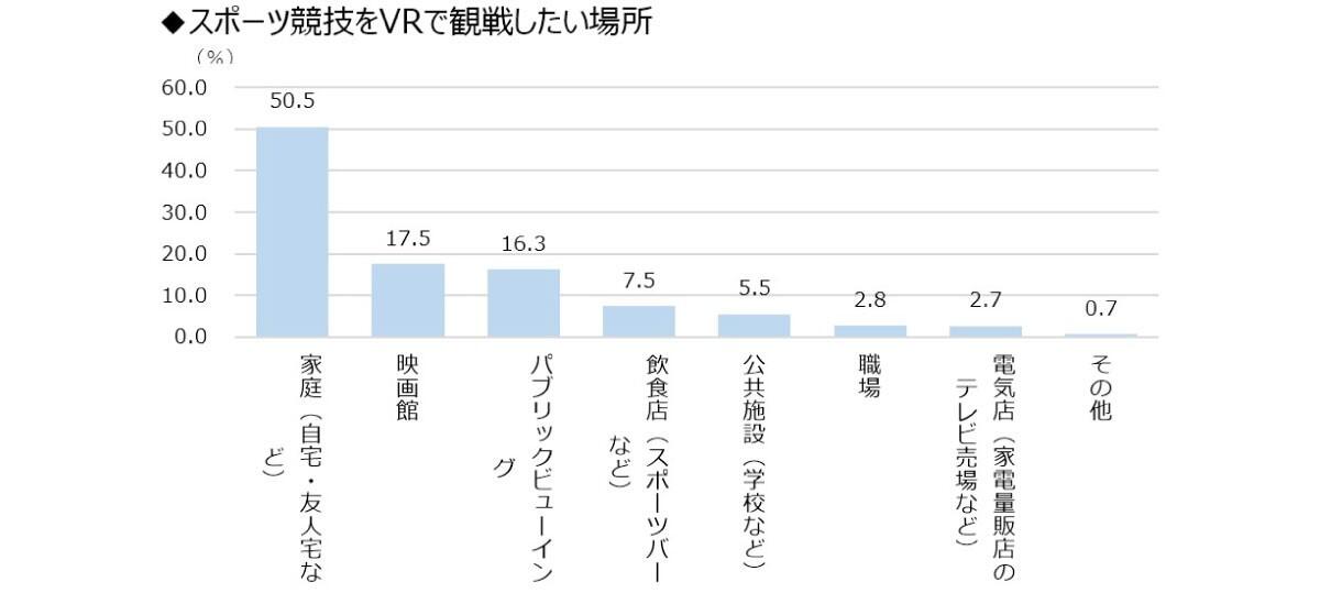 VR観戦をしたい場所について聞くと、「家庭」が最多。「映画館」「パブリックビューイング」が約2割と一定量のニーズがありそうです。