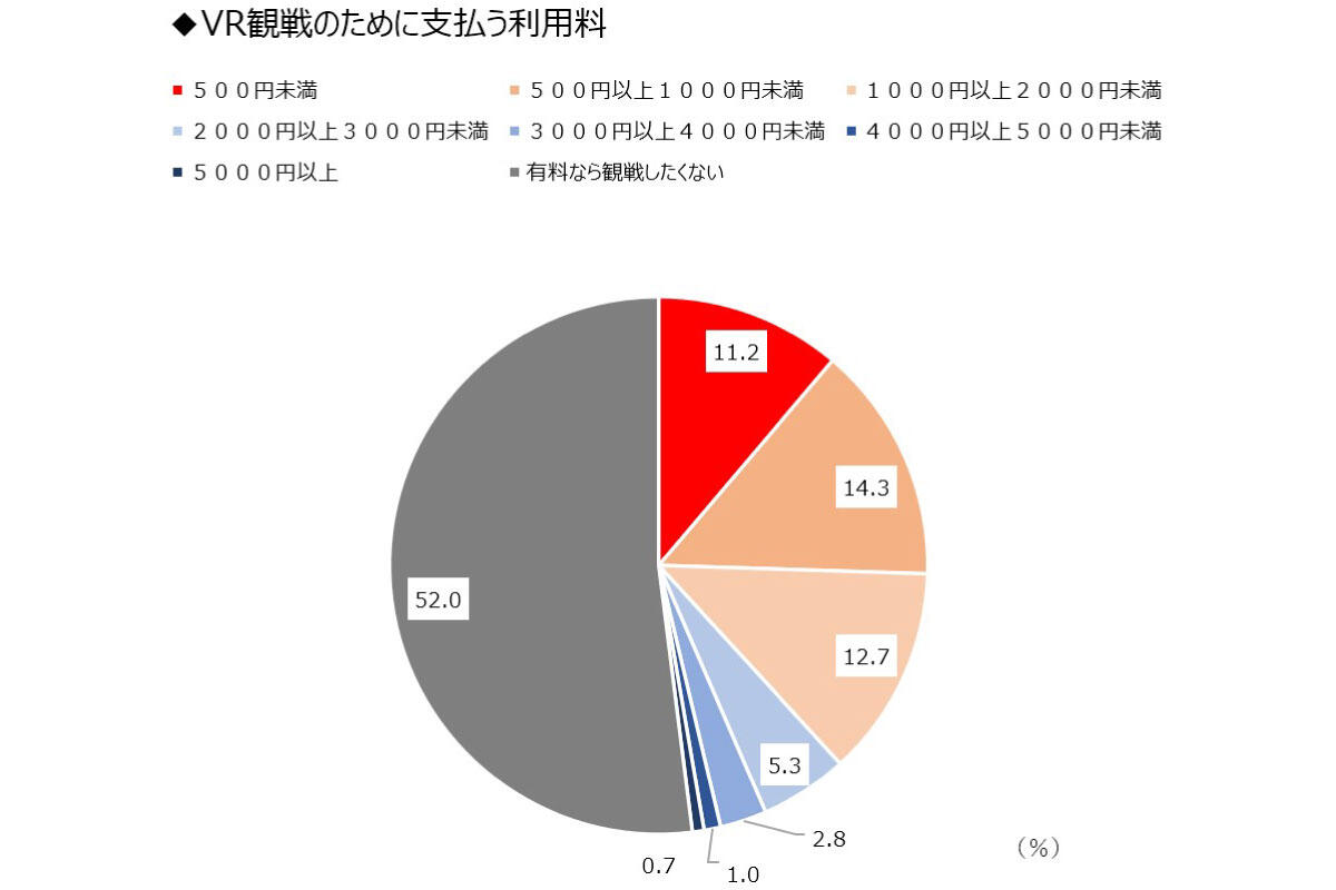 また、スポーツをVR観戦するための利用料は、2000円未満までの回答合計が約4割にのぼるのと同時に、「有料なら観戦しない」という回答も半数にのぼっており、個人の価値観が値段に影響していそうです。