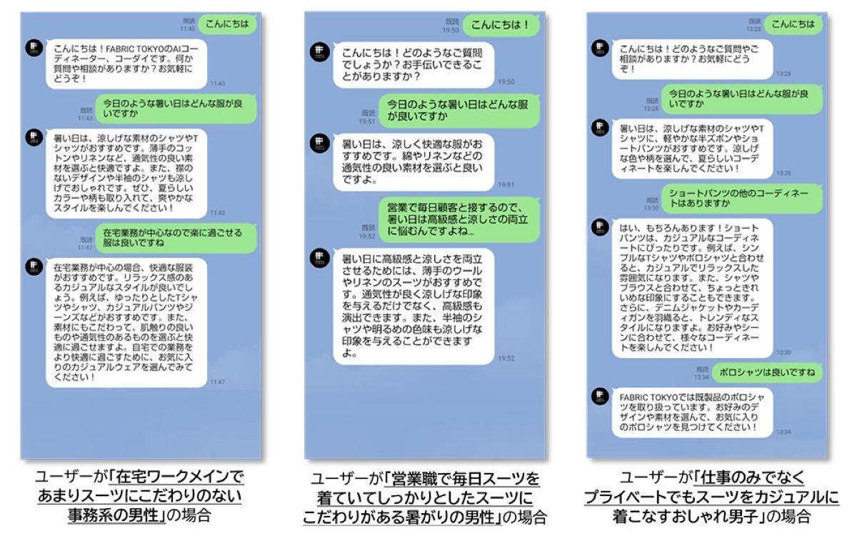FABRIC TOKYOさんは、一度店舗に来店して商品を購入したお客様に対してアンケートもとっているので、購入データとアンケートによる嗜好性データを基に個別の提案を行う仕組みがとれました。購入した商品や好み以外に、例えば勤めている企業が毎日スーツを着なければいけないのか、カジュアルでもいいのかとか、普段どういう風な服で日常を過ごしているのかといった情報も把握します。それに基づいて適切な答えを返すということになっているので、同じ天気同じ場所に行くにしてもその人のライフスタイルで全部変えて提案してくれるというわけです。