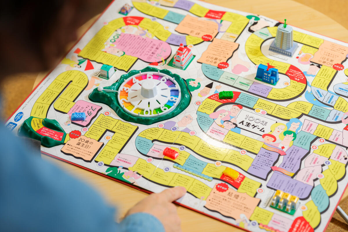 生活者との直接の接点で得た知見をベースに、タカラトミーさんと連携し、「100年人生ゲーム」を作りました。通常の「人生ゲーム」では、お金を集めて最後に億万長者になるのがゴールですが、「100年人生ゲーム」で集めるのは幸福度を点数化したウェルポ(ウェルビーイングポイント)で、いろんな経験を通して一番ウェルポを獲得できた人が勝ちます。マスに書かれたエピソードは、「かたりば」やアンケートで得られた実話がベースになっています。ゴールである100歳の誕生日を目指して、100年人生の疑似体験をしながら、自分たちの人生についても話し合ったり考えたりできるという設計にしました。
