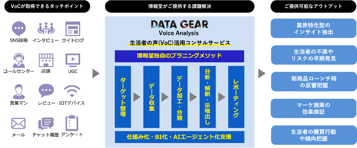もっとも、AIはあくまでもツールです。ツールが出したアウトプットをどう解釈し、どのようにクライアントのビジネスにつなげていくか。そこを担うのは、あくまでも人です。マーケティングやプラニングのプロである博報堂のメンバーが分析結果を次のアクションにつなげることで、データを具体的な価値に変えていく。〈DATA GEAR Voice Analysis〉はそこまでのスコープをもったソリューションです。